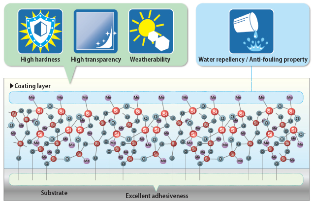 Coating agents made from silicone oligomers form highly hard, transparent, and weather-resistant films, and their excellent water repellency and water sliding properties contribute to maintaining the beauty of the substrate.