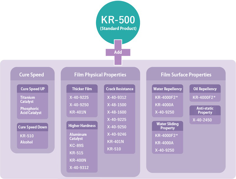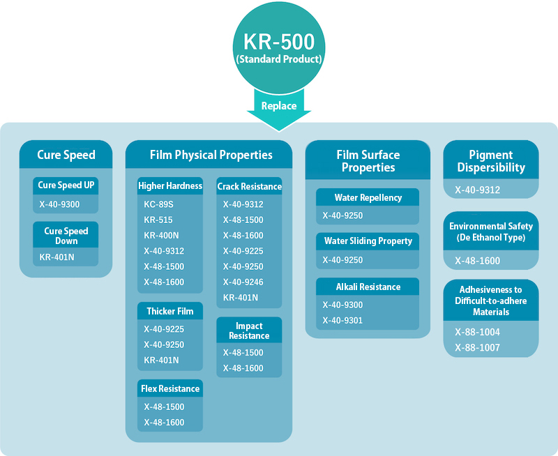 2. “Replacing” KR-500 with another silicone oligomer product enables to improve curing speed, coating physical properties, coating surface properties, etc.