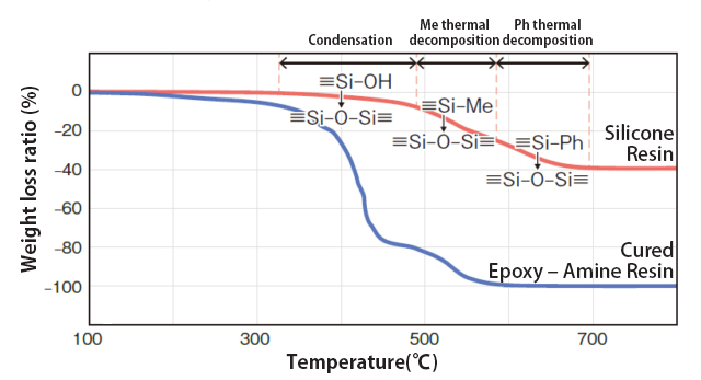 However, because it has a small number of organic groups such as methyl and phenyl, the cured film reacts with oxygen and thermally decomposes and volatilizes when exposed to high temperatures. But silica (SiO2) remains afterwards, making it more flame-resistant than organic resins.