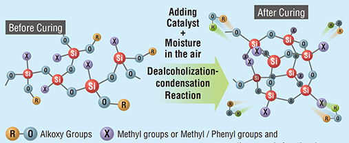 Shin-Etsu Chemical uses the term “silicone oligomers” to refer to relatively low-molecular-weight silicones with a three-dimensional cross-linked siloxane backbone. Among them, Type A products, which contain only alkoxysilyl groups as reactive functional groups, are mainly used as raw materials for room temperature curing coatings.