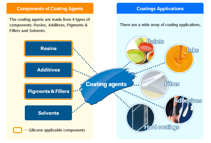 Shin-Etsu Silicone has four methods for using the three constituents of coating agents: "Resins," "Additives," and "Pigments & Fillers," including "Silicone based Resins," "Resin Hybridization Agents," "Surface Modifiers for Coatings," and "Surface Modifiers for Pigments & Fillers".