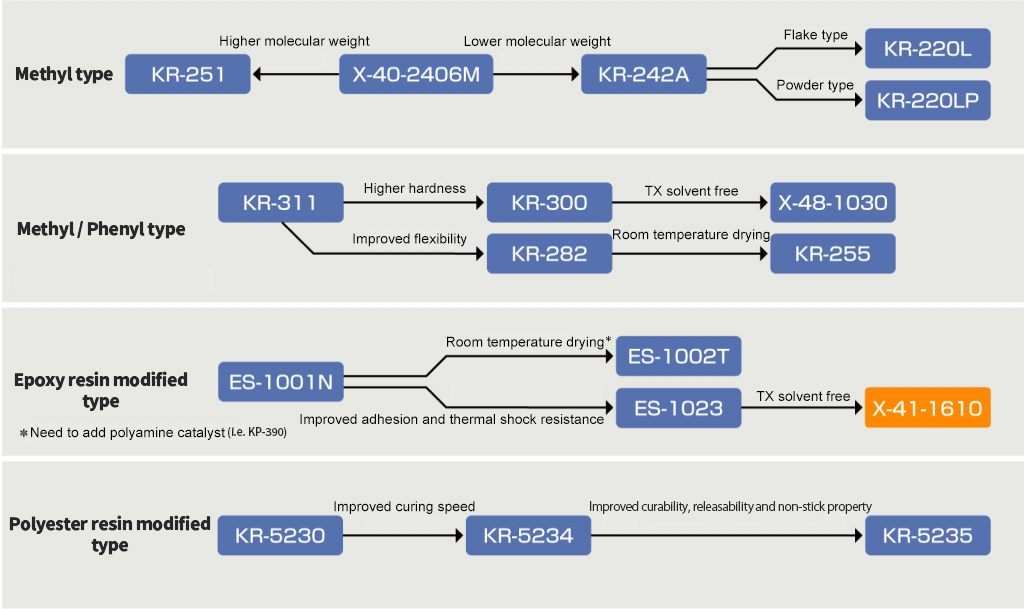 KR-300 Methyl / Phenyl Type Heat Cure Organic Solvent Main Agent High High hardness methyl / phenyl resin ・It forms a film with excellent heat resistance.