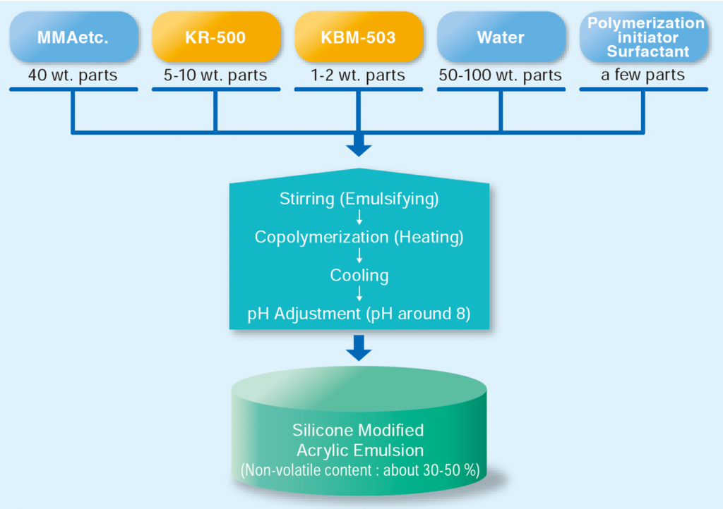 KR-500 is a methyl silicone oligomer with methoxy groups. By mixing it with organic resins having reactive groups with methoxysilyl groups or by demethanol reaction, it can add heat resistance, weather resistance, and chemical resistance to resins. It can also be applied to water-based resins.
