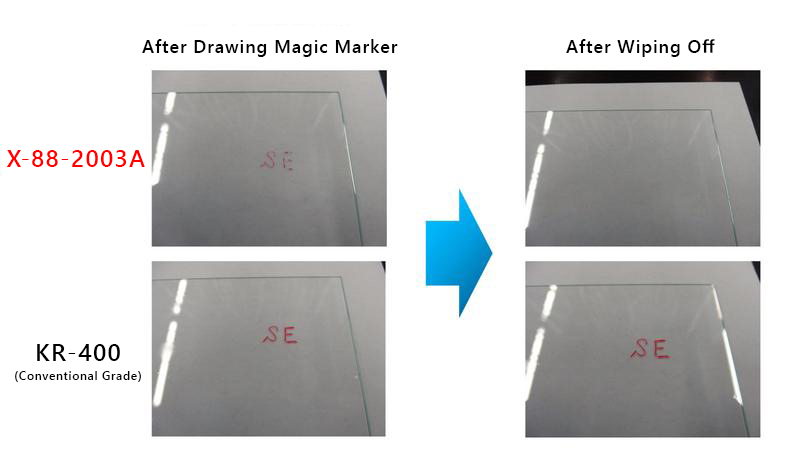 Lines were drawn on the cured film with an oil-based magic marker pen (organic solvent type Mackie ultra-fine: made by ZEBRA Co., Ltd) and evaluated whether they could be wiped off with tissue paper. The cured film of KR-400 (conventional product) could not wipe off the writing cleanly, but the cured film of X-88-2003A could wipe off the writing cleanly.