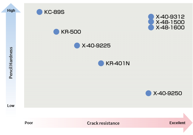 | X-48-1501 | Type A | Room Temperature Cure | Solvent-free (100% Silicone Content) | Main Agent, Resin Modifier | High | High hardness, flex resistance, heat crack resistance, impact resistance oligomer | ・It forms a film with high hardness, flex resistance heat resistant crack resistance and impact resistance. |