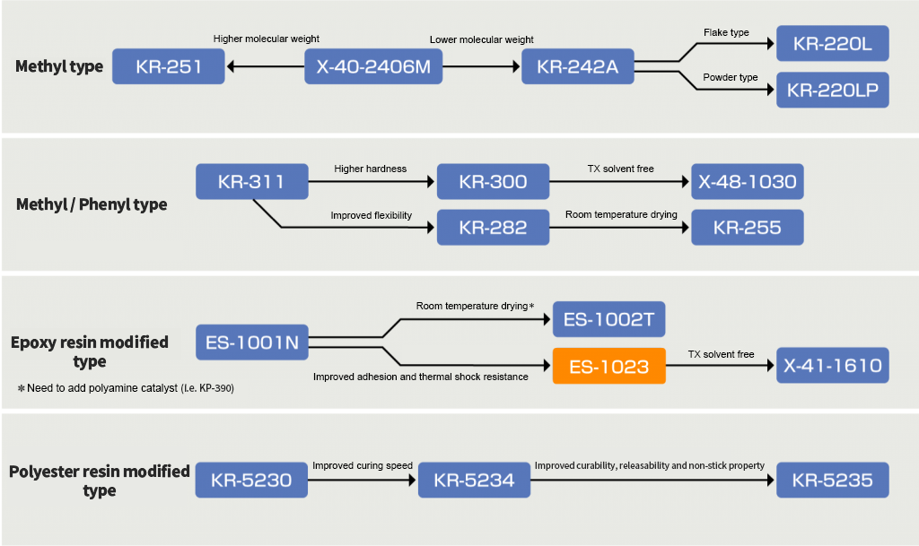 | KR-311 | Methyl / Phenyl Type | Heat Cure | Organic Solvent | Main Agent | Medium | Medium hardness methyl / phenyl resin | ・Standard product of methyl / phenyl type ・It forms a film with excellent heat resistance. ・Excellent compatibility with organic resins. ・It has been mainly used as binders for heat resistant paints. |