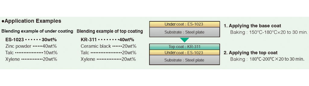 By using ES-1023, an epoxy-modified silicone resin with excellent anticorrosion and adhesion properties, as an undercoat. And KR-311, a straight silicone resin with excellent heat resistance, as a topcoat, a heat-resistant film with excellent durability can be formed.