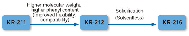 | KR-212 | Methyl / Phenyl Type | Incurable | Organic Solvent | Resin Modifier | – | Methyl / Phenyl resin for resin modification | ・Organic resin modifier ・Excellent compatibility and flexibility than KR-211 ・It can impart heat and weather resistance. ・ It has been mainly used as coating applications. |