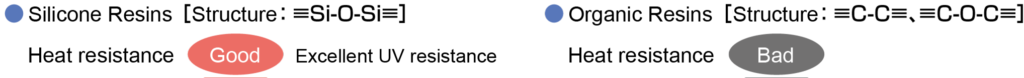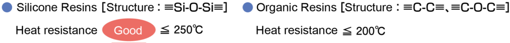∗Epoxy-amine cured products decompose with the generation of ammonia and aldehyde as the temperature rises, and completely decompose in the high temperature range (around 600°C), while silicone resin undergoes condensation, methyl group pyrolysis, and phenyl group pyrolysis as the temperature rises. The final cured product is composed of -Si-O-Si- bonds only, and is stable even at high temperatures (700℃ or higher).