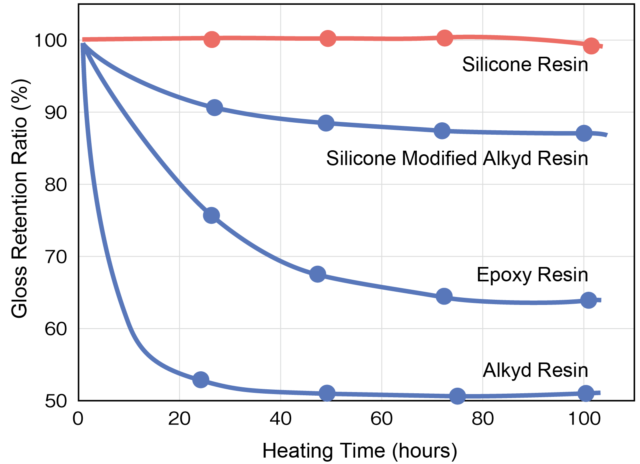 - Silicone resin has very good heat resistance. For this reason, it is used as a vehicle for paints used in a temperature range (200°C or higher) where ordinary organic resin-based paints cannot be used. They also have excellent weatherability and water resistance, making them resistant to degradation due to outdoor exposure, and they have a high affinity with general inorganic pigments. There are a wide variety of heat-resistant coatings depending on the application, material, temperature range, etc. Silicone resins are used in a wide range of products.