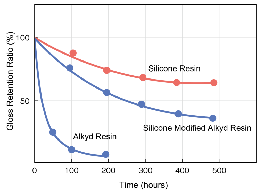 This shows the change in gloss retention using a weather meter. It can be seen that silicone resin and silicone-modified alkyd resin maintain a high gloss retention rate while organic resin (alkyd resin) drops significantly.