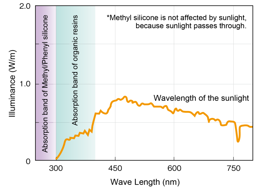 However, methyl silicone resin shows almost no absorption in the ultraviolet region, and methyl/phenyl silicone resin also has an absorption band below 280 nm, so it is hardly affected by sunlight.