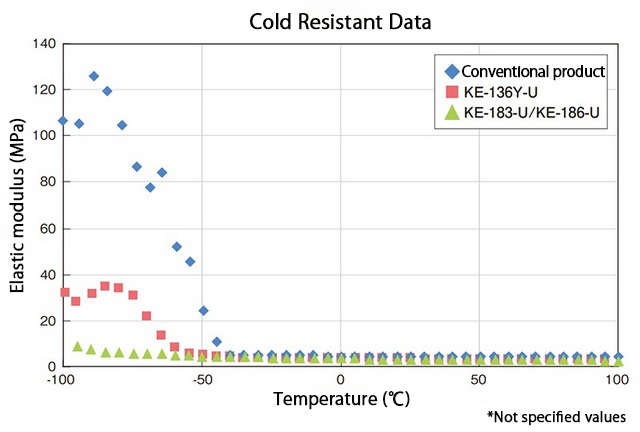KE-186-U Cold resistance Milky white translucent C-8 2.0 160℃ × 10 m 200℃ × 4 h 277 65 1.19 11.0 480 19 12**