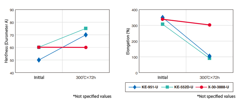 | X-30-3888-U | Heat resistance | Dark brown | C-23N | 1.3 | 120℃ × 10 m | 150℃ × 1 h | 264 | 55 | 1.19 | 9.1 | 360 | 12 | ||