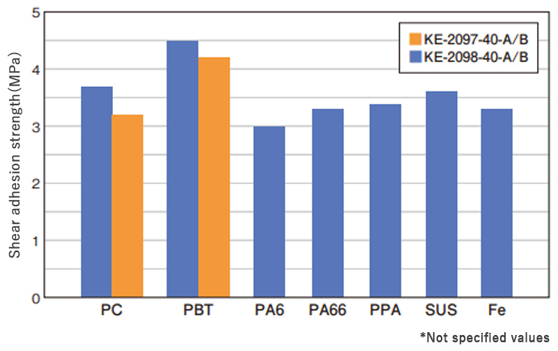| KE-2098-60-A/B | No post cure (Reduced low-molecular-weight siloxone content), self-adhesive | Translucent | 870/790 | 22 | 47 | 150℃ × 5 m | - | 61 | 1.14 | 2.5 | 8.9 | 430 | 42 | - |