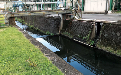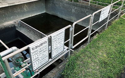 When the TOC meter or the oil film detector operates and an automatic gate shuts off the water in the rainwater ditch, the drainage is temporarily stored in the emergency pit. The stored water is transferred to a wastewater treatment facility and discharged into the rivers after purification.