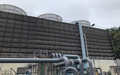 This is a cooling facility for removing the reaction heat generated during silicone production and the condensing heat generated in the distillation process. Pumps supply water to the production facilities and the water warmed in the cooling process returns to the cooling tower. It is cooled by the tower and supplied again to the production facilities. The tower removes the heat efficiently by using circulating water only by replenishing water that evaporates during heat dissipation.