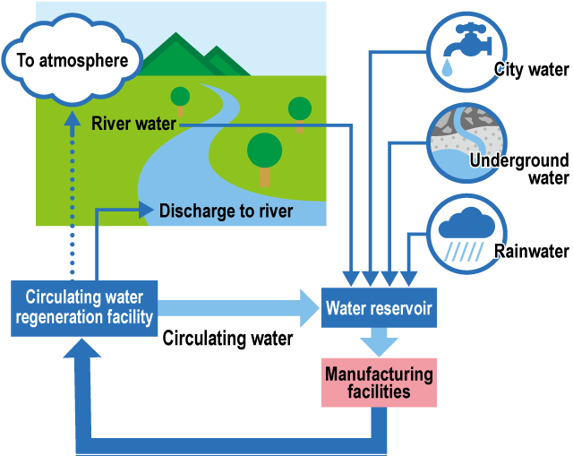 The Isobe and Matsuida plants take in water from the Yanagise River flowing in the plant and a waterway divided from the Usui River in the vicinity of the plant, respectively, to use it as water sources of industrial water for producing silicones. In addition, city water is also partly used.